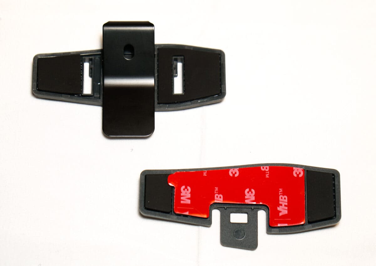 マウントと合体してヘルメットに取り付けるのに、クリップタイプと粘着タイプの2種類が用意されているので、ヘルメットタイプに応じて使い分けよう。