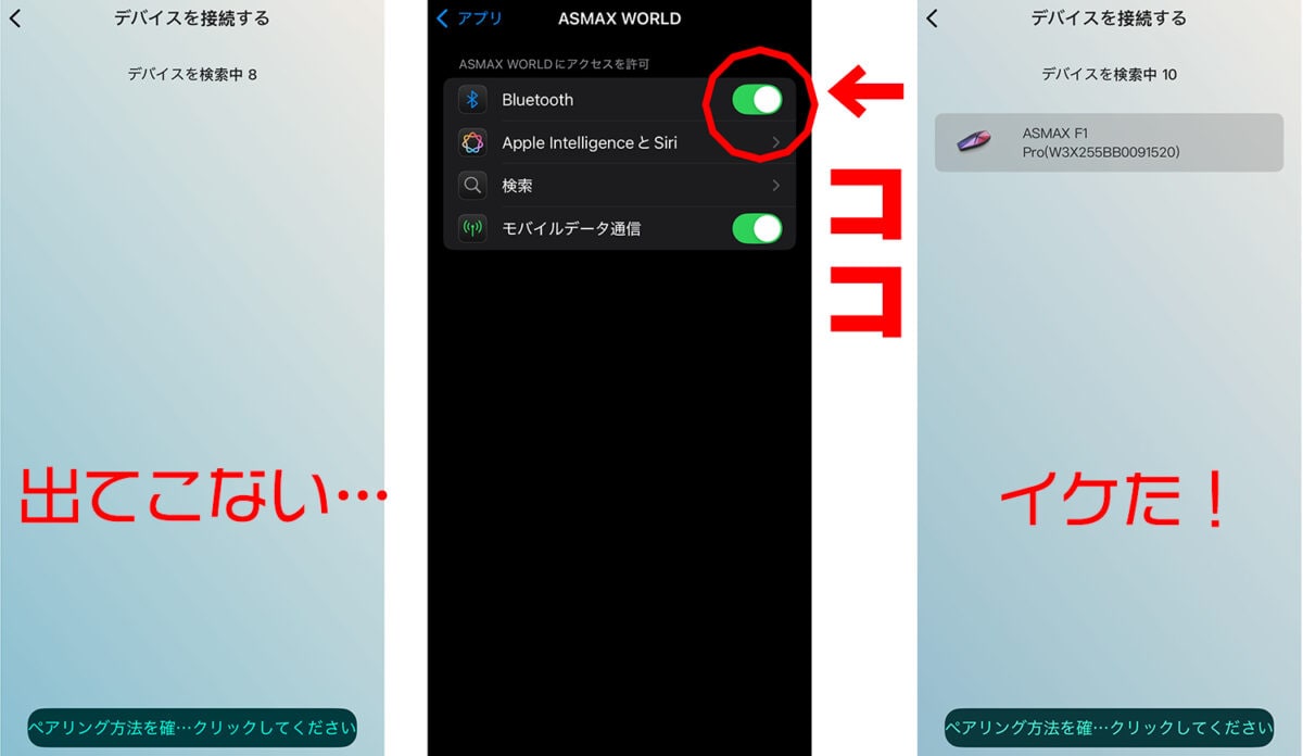 デバイスを専用アプリと接続する際、本来ならデバイスとスマホをペアリングするだけで「検索」にデバイス名が出てすぐに接続できる。1度接続すれば、次回からはすぐに接続できるのだが、iPhoneだといくら検索しても出てこないことが……。