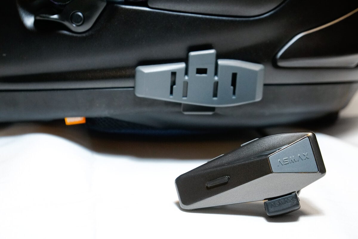 ヘルメットへの取り付けにはバッククリップ式を採用。本体背部にあるツメを、ベースのくぼみにハメてカチッと固定する手軽さ&取り外しは上のつまみを押して上に引き抜くだけ。