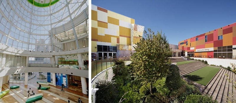 幅広いジャンルのショップや映画館など約180店が出店しており、光・炎・森・大地の4つのゾーンからなるフードコートも特徴。ウッドデッキや人工芝のある中庭「センタープラザ」や屋内キッズスペースは、子どもを遊ばせるのにぴったりです。センタープラザや大きなガラスのアトリウム「クリスタルコート」では各種イベントも開催しています。