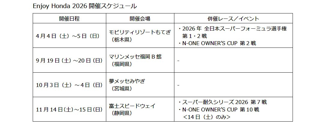 ホンダは2025年12月18日、体験型イベント「Enjoy Honda 2026」の開催スケジュールを発表した。