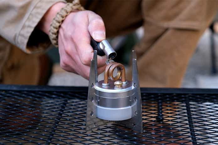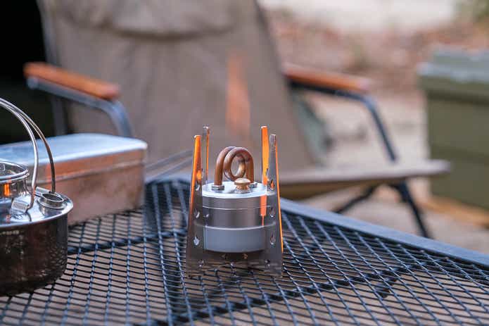 使い方は、本体にアルコールを注入し、クルクル部分をプレヒートして着火。付属の五徳を使えば、湯沸かしや調理も可能です。