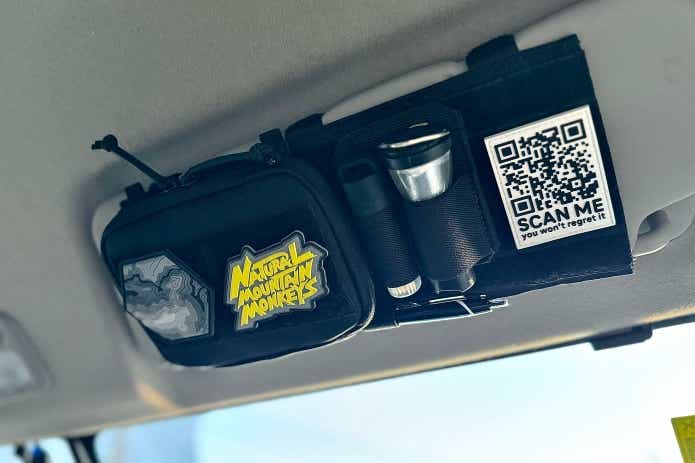 まずは、目からウロコなアイディアが注目を集めたこちら! 簡単にクルマのサンバイザーに取り付けられる「MOLLEバイザーカバー」で、ベルクロでグルッと固定するだけなので車種関係なく装着可能です。