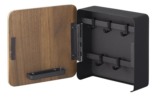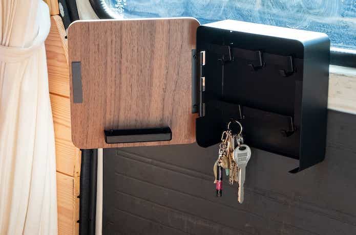 木目調のパネルを開けると、2段のバー+5個のフック+小さいトレーが。カギやLEDライトをひっかけたり、アクセサリーや常備薬を収納するのに便利! 裏面がマグネットになっているので、金属部分にペタッと貼り付けるだけで設置できます。