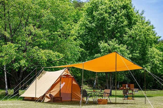 テントの入り口からそのまま延長する形で張れば、テーブルやチェアを配置できるスペースを確保できます。