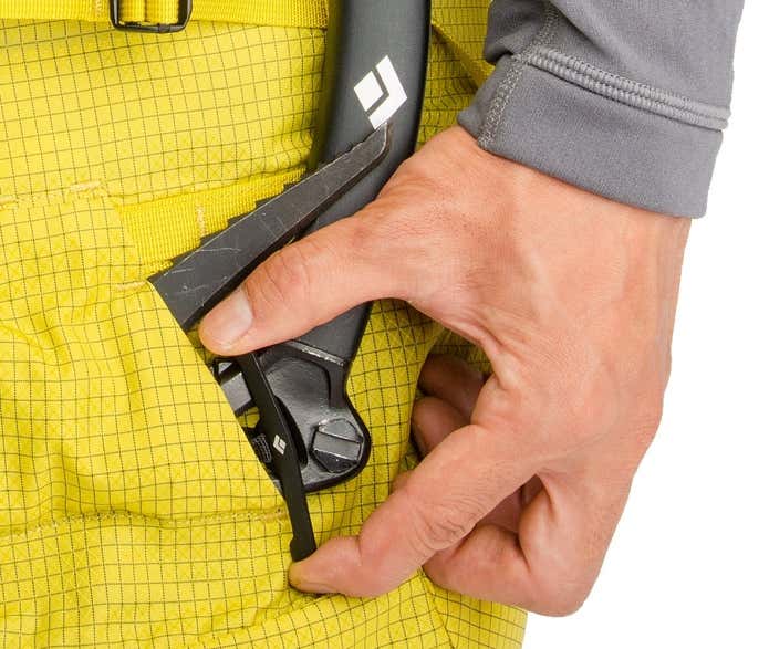 ピッケルやアイスアックスのヘッド部分を収納するアイスツールヒップポケットには、メタルフックが付属。シャフトを固定するストラップも太めで、アイスツールをしっかりと保持することができます。