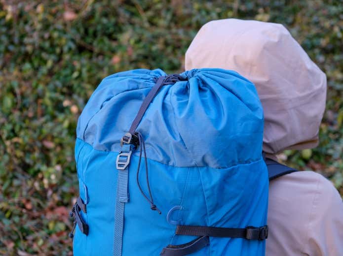 雨蓋をはじめとした各種パーツを目的に合わせて取り外して、さらに軽量化することも可能。雨蓋を外した時にザック上部を覆うフラップジャケットを内蔵しているため、巾着状の開口部が剥き出しにならず、スマートな外観と防水性をキープできます。