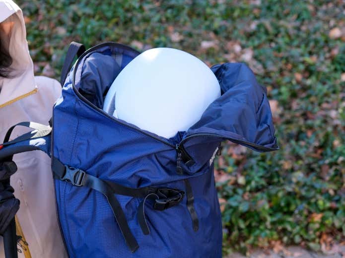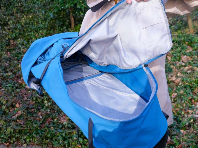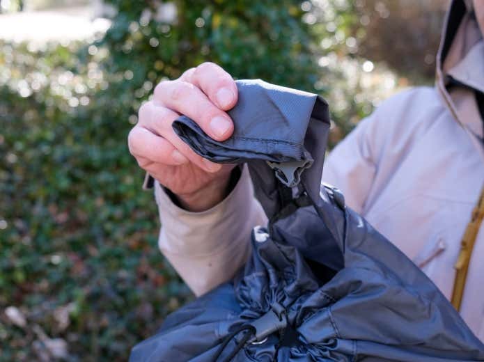 撮影:YAMA HACK編集部(1枚目:フラップジャケットをかぶせた様子、2枚目:フラップジャケットは開口部の内側に内蔵されている)