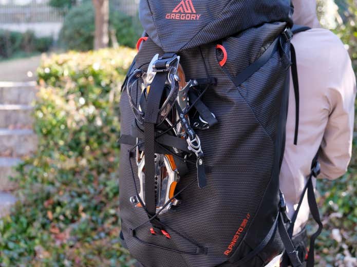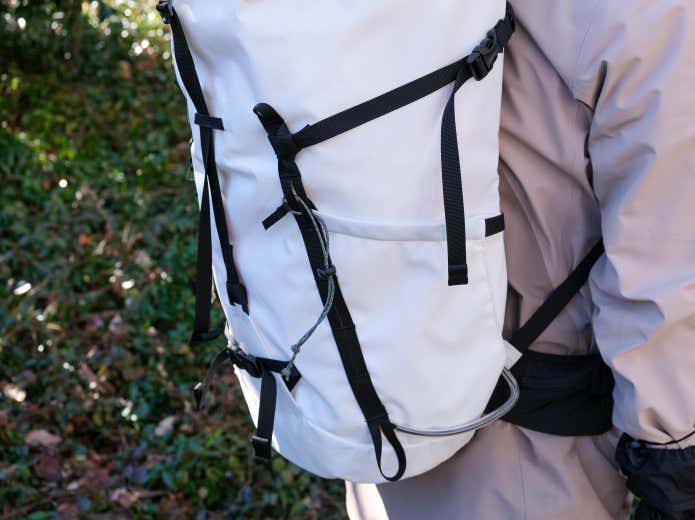 様々なギアを固定できるバンジーコードやループを備えたフロント部分と、スキーも取り付け可能なサイドのループが特徴的。内部は軽量素材と耐久性のあるアルミニウムのハードウェアで構成されており、軽量でありながら収納性は抜群です。