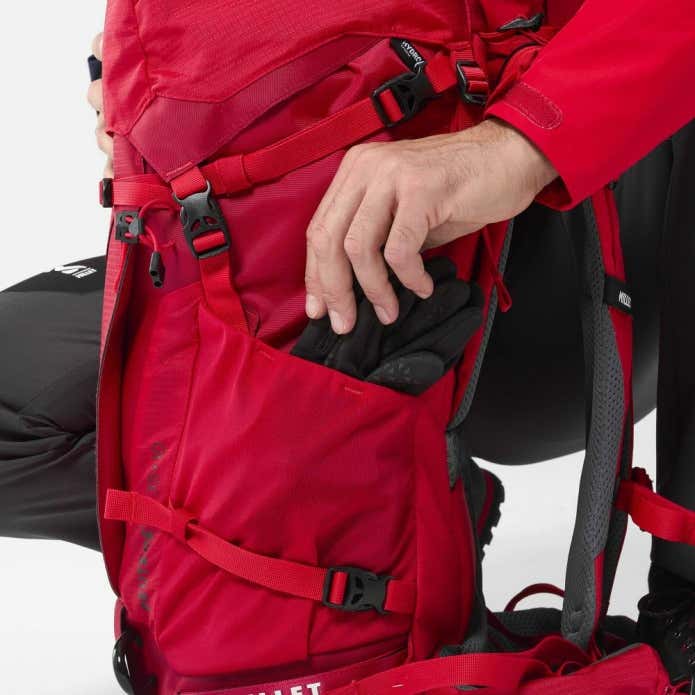 アックスホルダーやクランポンポケット、スキーホルダー、ロープホルダーなど、ギアを効率よく収納できる各種機能を備えており、アイスクライミングやスキーツーリングといった冬の幅広いアクティビティに対応。一年を通してオールラウンドに活躍するテクニカルパックです。