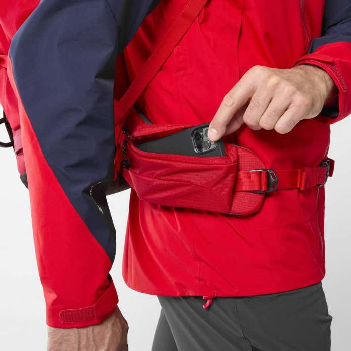 クライミングハーネスと干渉するヒップベルトは取り外し可能なだけでなく、ポケットがついた厚みのあるフィン部分とベルト部分を分割可能。ベルトだけを使用して安定感をキープする方法もありです。