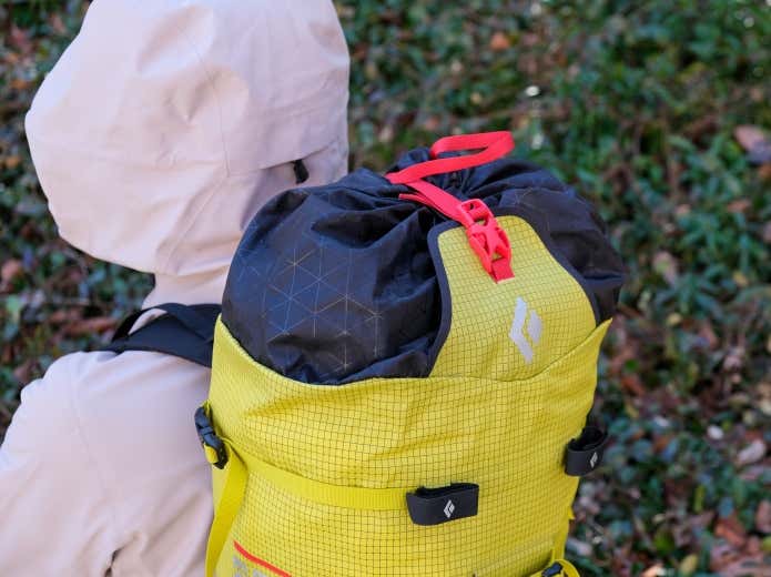 雨蓋を外した状態でも、ドローコード付きスカートでザック上部をしっかりと覆うことができます。雨蓋あり・なしのいずれの場合でもシンプルな1本締めのストラップで、グローブを着用したままワンアクションで開閉できるのもポイント。