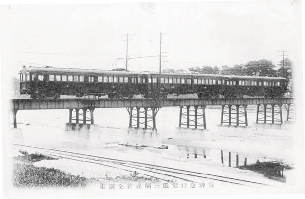 当時の阪神急行、大阪市内高架化などの完成を機に近代的なスチール製電車を投入しました。屋根が深く、車体はリベット多数の無骨なスタイルながら、社会は鉄道近代化を実感しました。