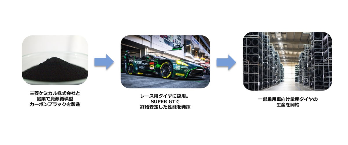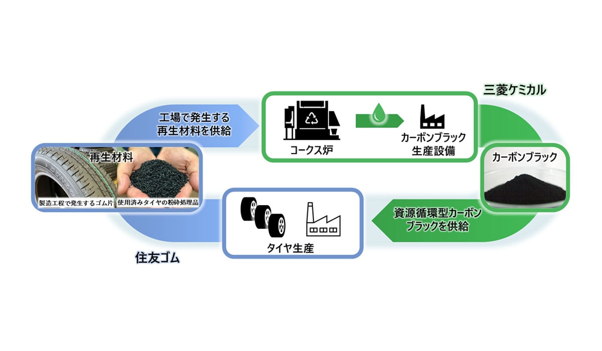 カーボンブラックはタイヤの主原料の一つであるが、今回使用を開始した資源循環型カーボンブラックはタイヤ製造工程で発生するゴム片や使用済みタイヤをケミカルリサイクルすることで製造されるもので、2025年1月から三菱ケミカルと協業で取り組みを進めてきた。