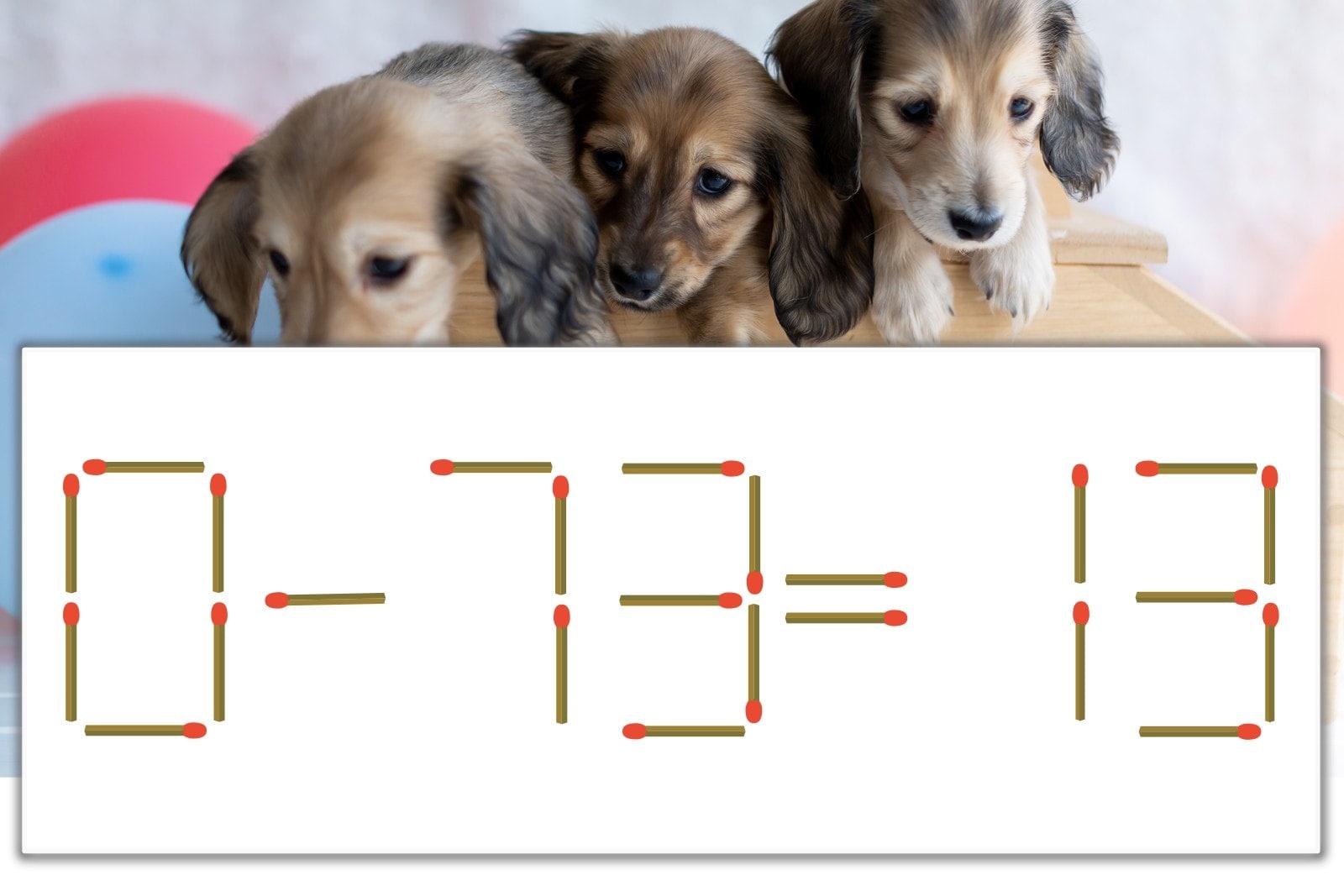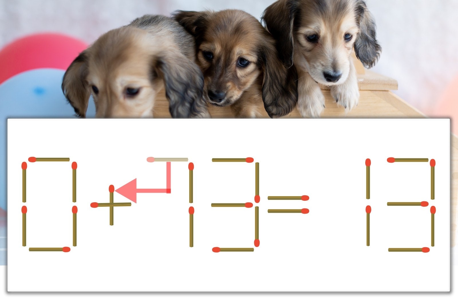 「7」を別の数字に変化させると答えが導き出せます。「7」のマッチ棒を1本移動して、「-」を「+」にしてみましょう。すると、「0+13=13」が成立します。