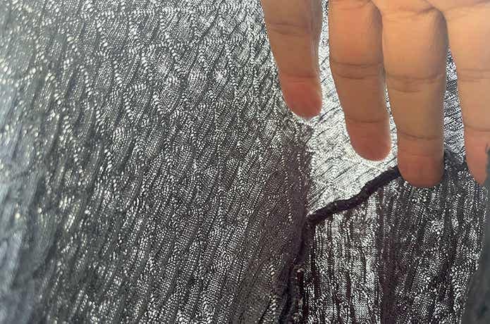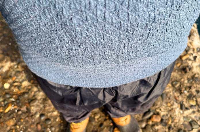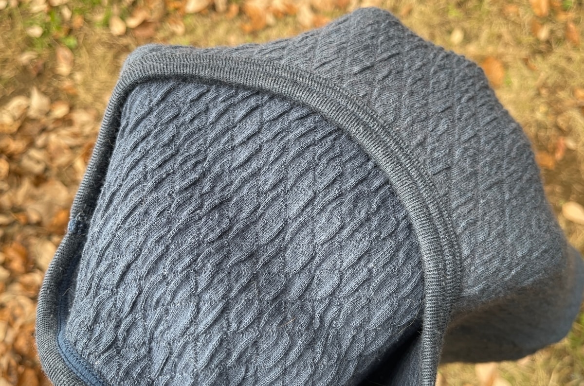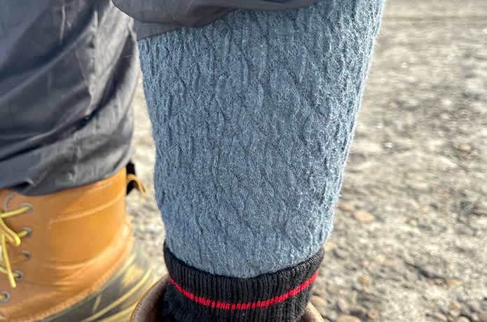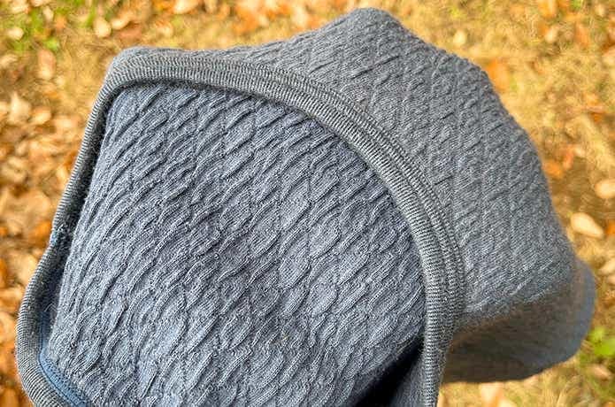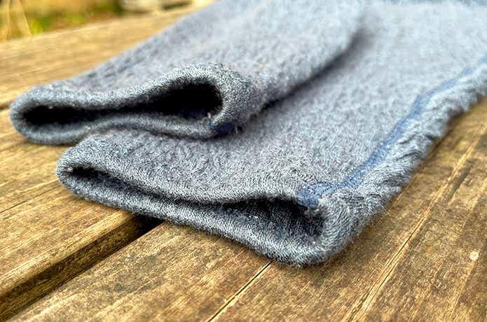 生地を見てみると複雑に編まれているのですが、内側にダンロン、中にナイロン、表生地にアクリルウールを使用した三重構造になっていて、体温で温められた空気を内側に閉じこめる設計になっています。
