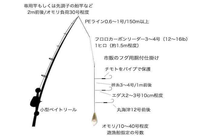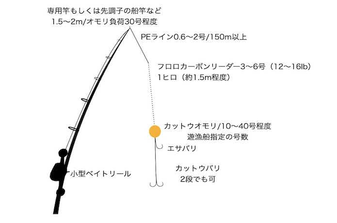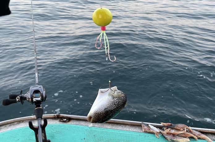 ショウサイフグはカットウ仕掛けか胴付き仕掛けを用い、船から釣るのが一般的です。