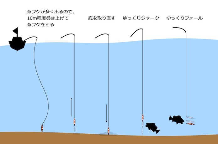 また、深場では人間が思っているよりもジグは動いていないので、速くて小さい誘いはNG。全動作を大きくゆっくり行いましょう。
