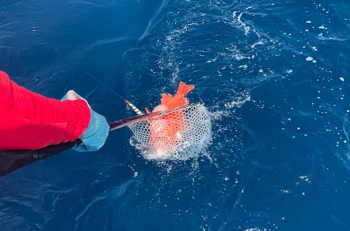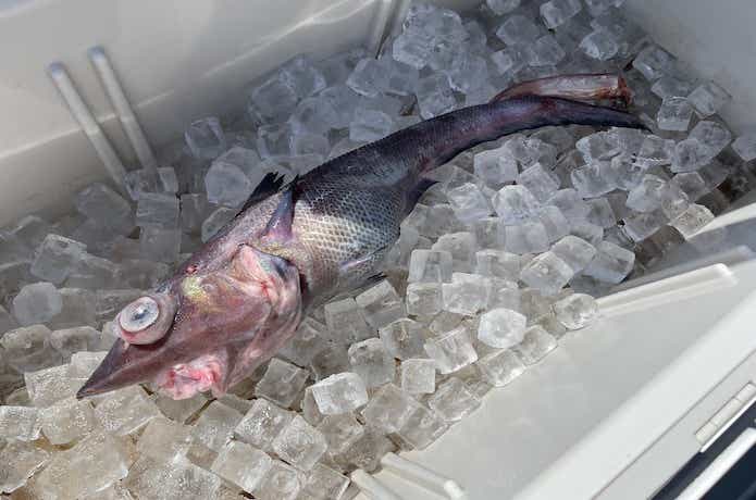 釣れる水深は300〜600m前後で、産卵期には200m程度の浅い場所まで上がってくることもありますが、釣れるのはほとんど300m以深です。