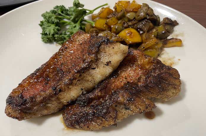 オリーブオイルで炒めて、オリーブとパプリカの付け合わせを添え、高級レストランの味わい!