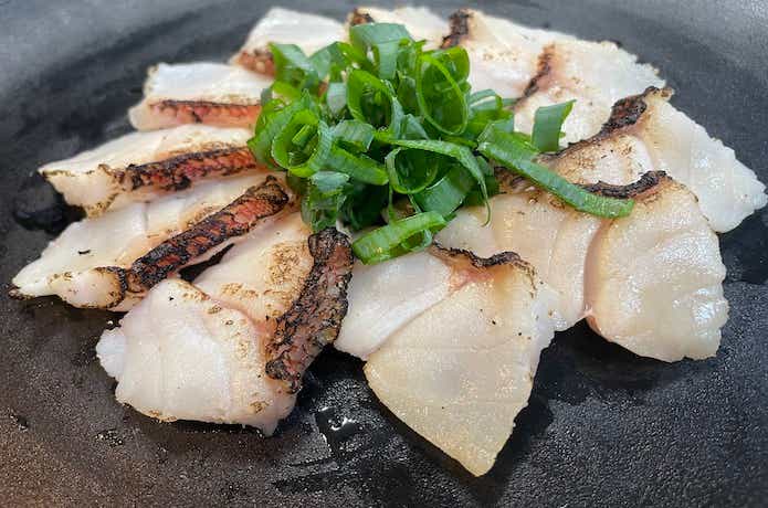 皮付きの身を炙り、さらに燻製で香り付けし、ポン酢と砂糖でいただくタタキは絶品!