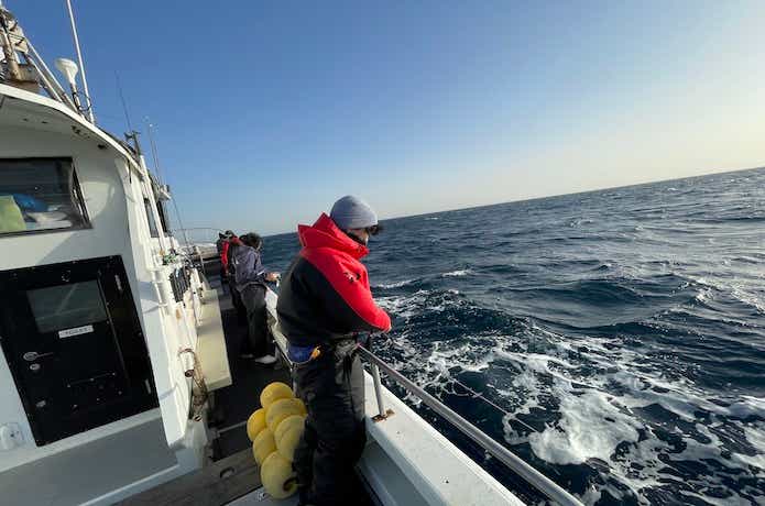 投入は船長の合図で、トモ側から順に船を前進させながらジグを落としていきます。