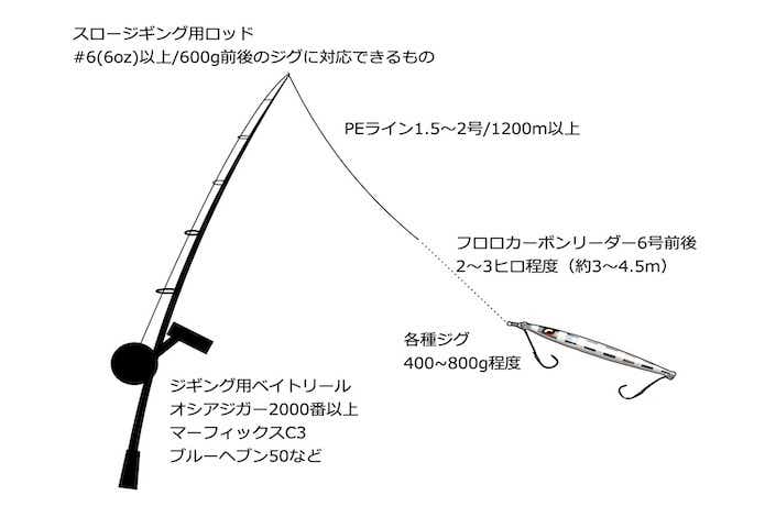 ロッドは、600g前後が操作できるスロージギングロッドを選びましょう。