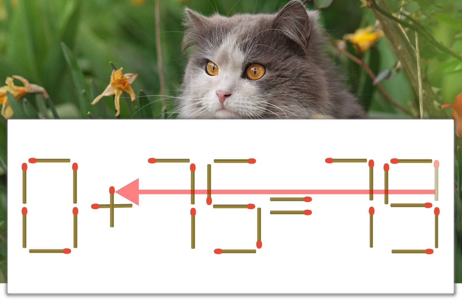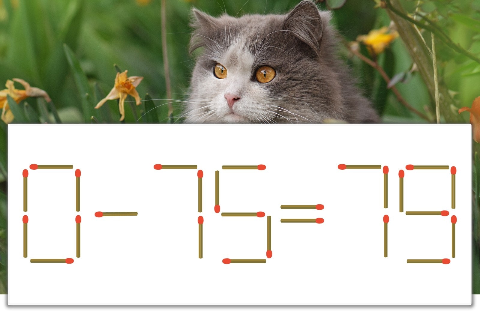 「9」を別の数字に変化させると答えが導き出せます。「9」のマッチ棒を1本移動して、「-」を「+」にしてみましょう。すると、「0+75=75」が成立します。