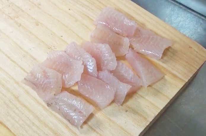 三枚に卸した身を、さらに一口サイズに切り、片栗粉をまぶします。