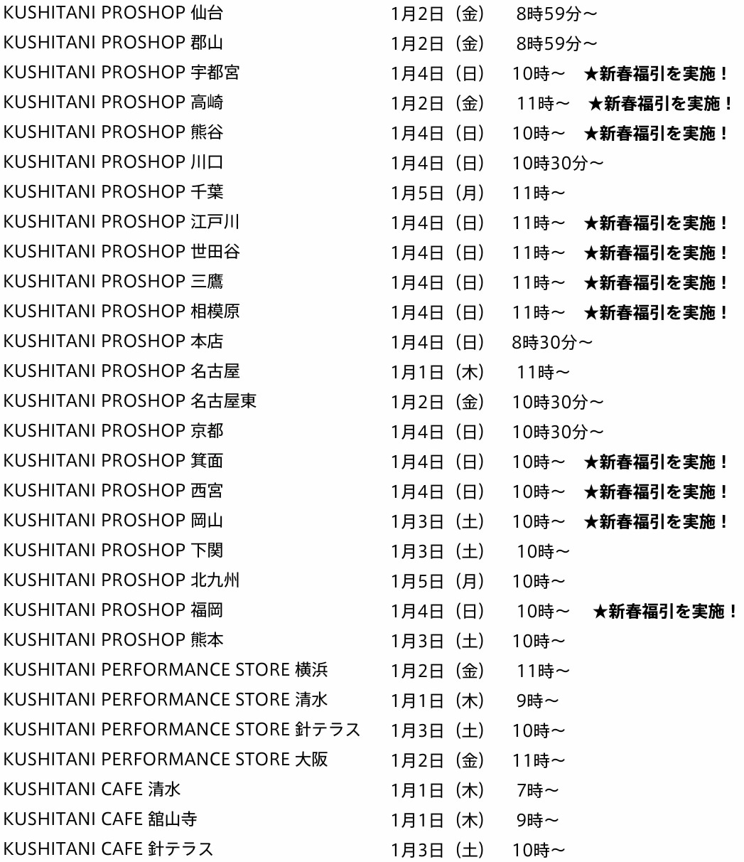 株式会社クシタニは、新春の買い物シーズンに合わせ、全国のKUSHITANI PRO SHOP11店舗限定で新春福引を実施するとともに、各ショップの初売り営業日を案内した。
