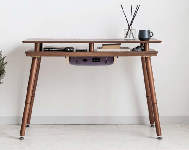 天板下にオープンシェルフが設置されてエアコンやテレビのリモコン、タブレット端末などを収納可能。継脚の脱着でローテーブル・ソファ用テーブルとして利用でき、こたつ布団をかぶせて暖房器具としても大活躍。搭載される石英管ヒーターは弱運転で1時間約2.6円の超省エネ仕様!