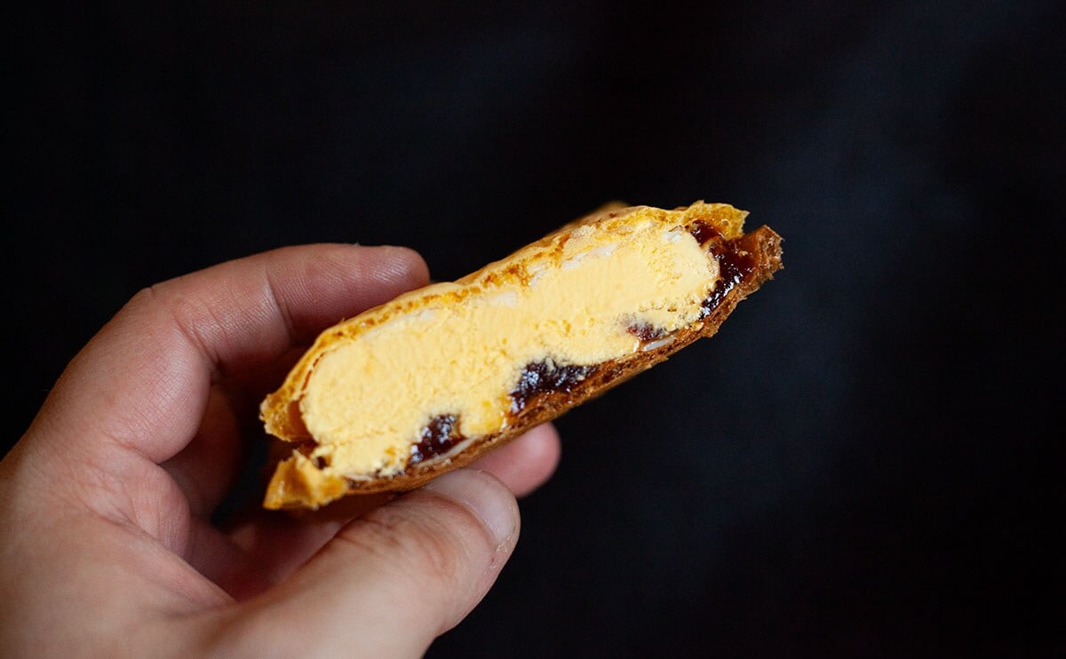 カスタードアイスには、加糖卵黄と北海道産生クリームを使用し、卵の風味をしっかり感じられる「固めプリン」をイメージしたという同商品。もなかをミルク感のあるホワイトチョコレートでコーティングすることで、プリンの濃厚さを引き立て、よりまろやかな味わいに仕上げたのだとか。