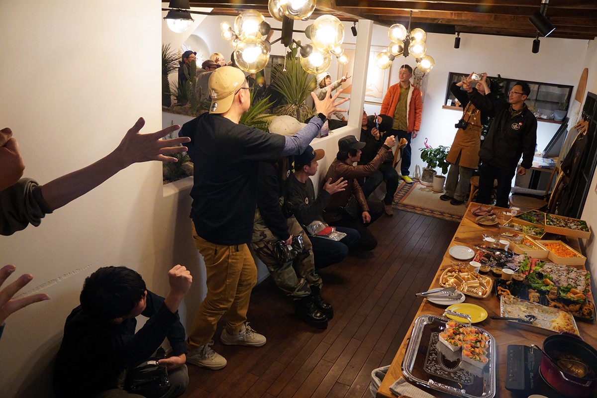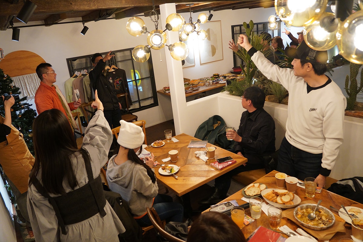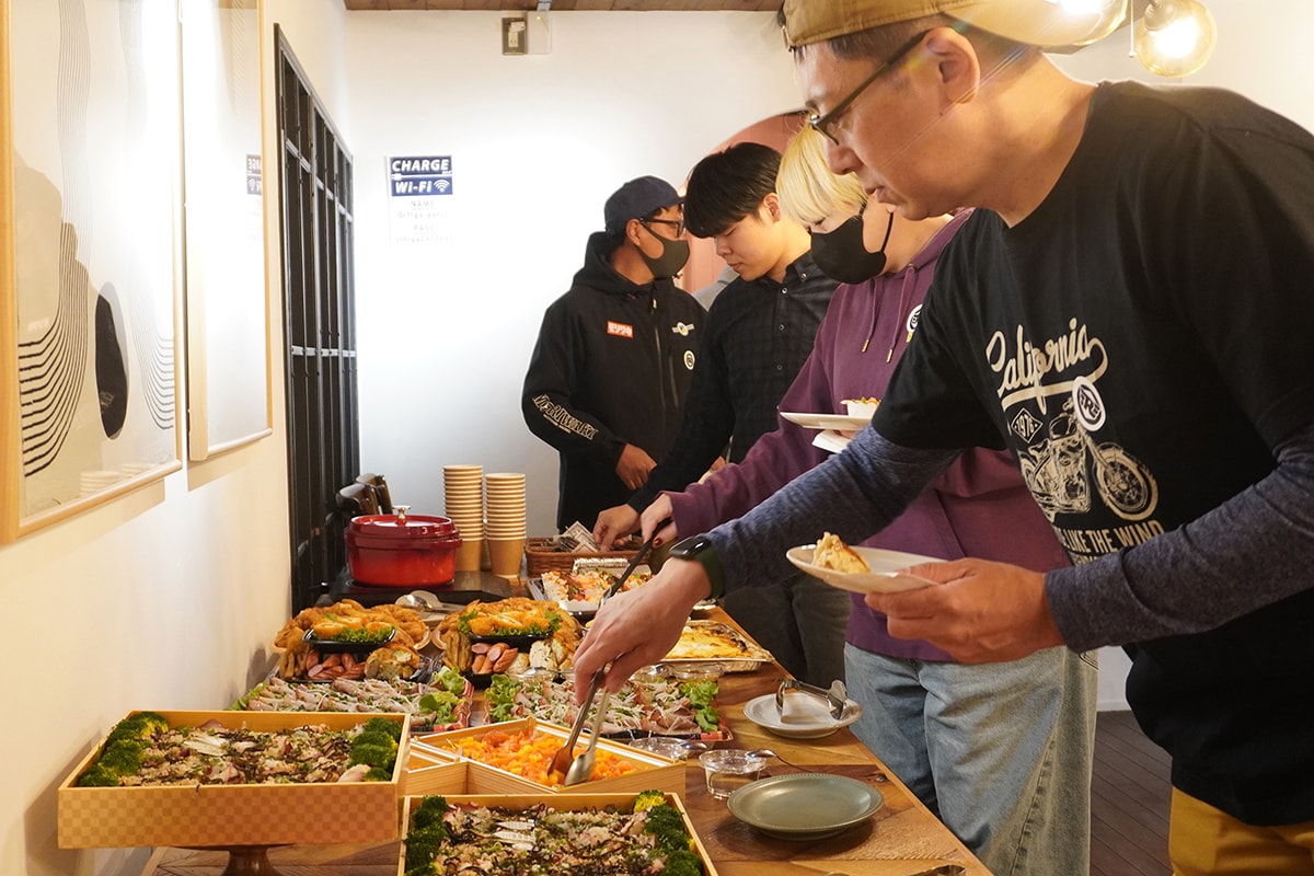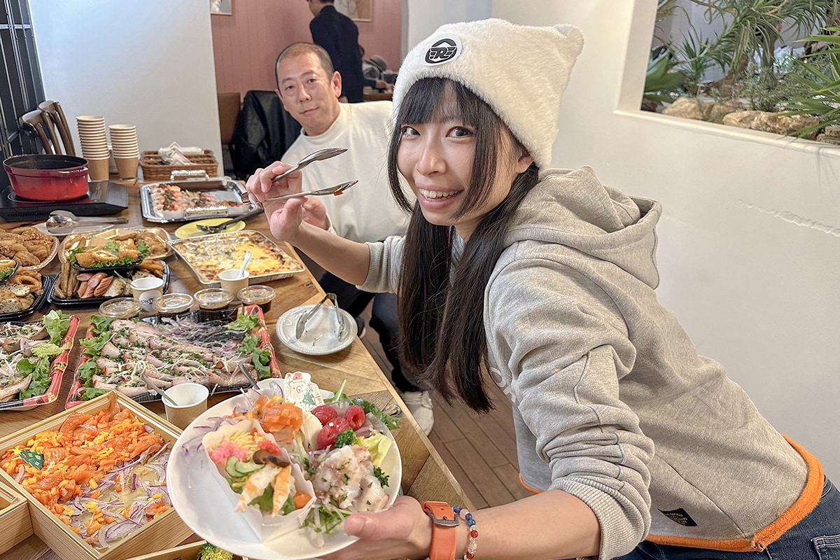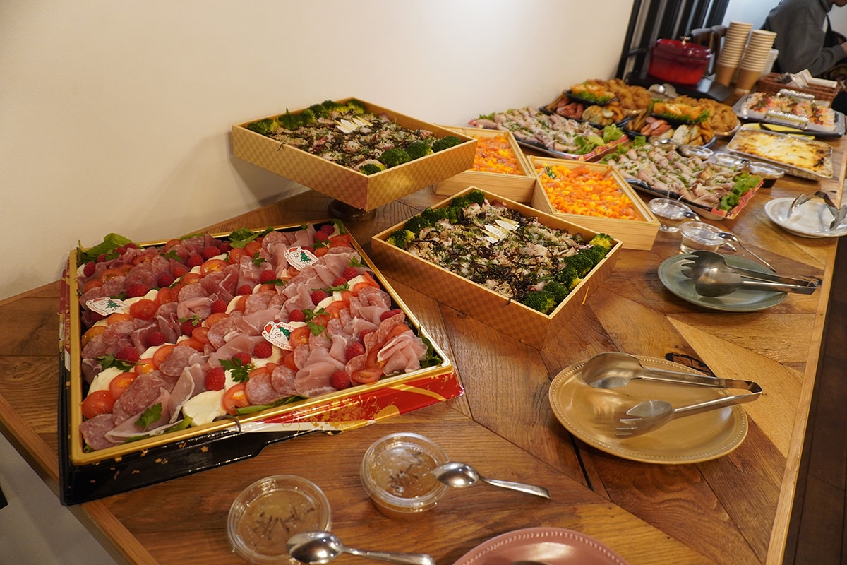 イベントはオルティガの2階を貸し切って行われた。クリスマス間近ということもあってツリーなどが飾られた店内に、ケータリングで運ばれてきた豪華な料理がずらりと並ぶ。これには来場者も驚き、バイキング形式で取り分けるときに写真を撮る姿も。