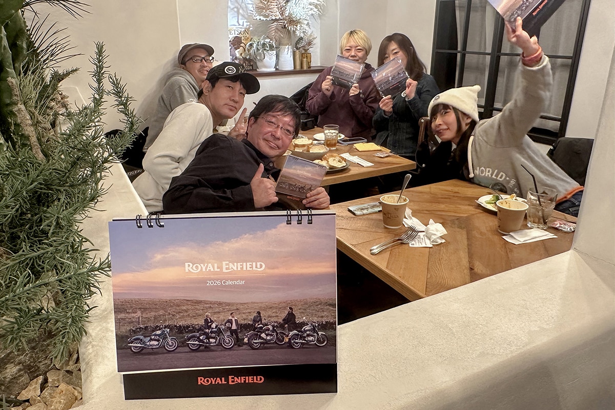 歓談を楽しんでいる参加者全員に、ロイヤルエンフィールドから「参加賞」として2026年の卓上カレンダーが配られた。これにはみんな大喜び。