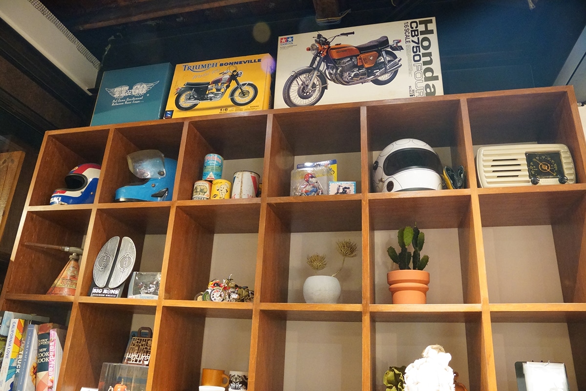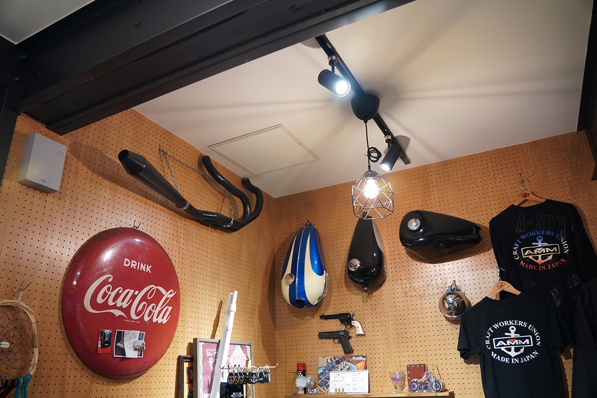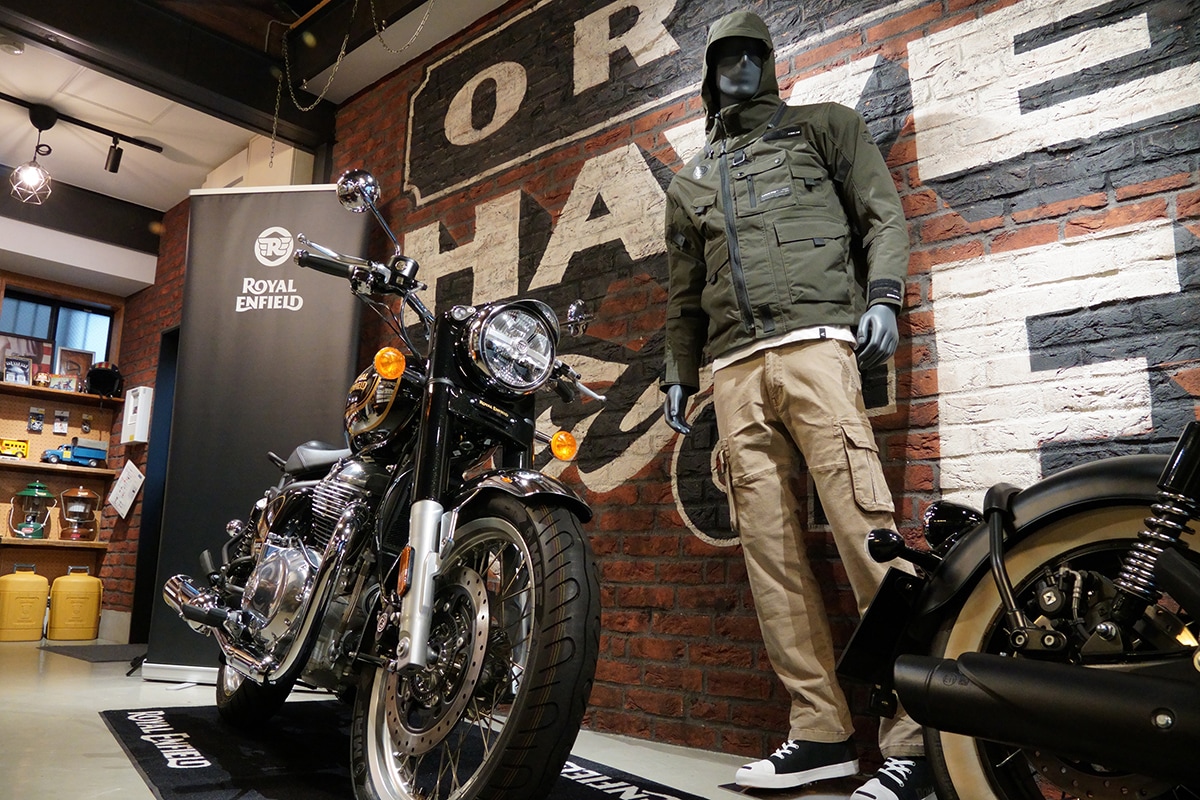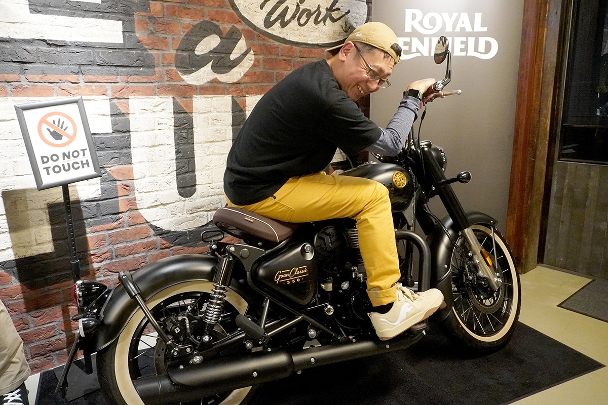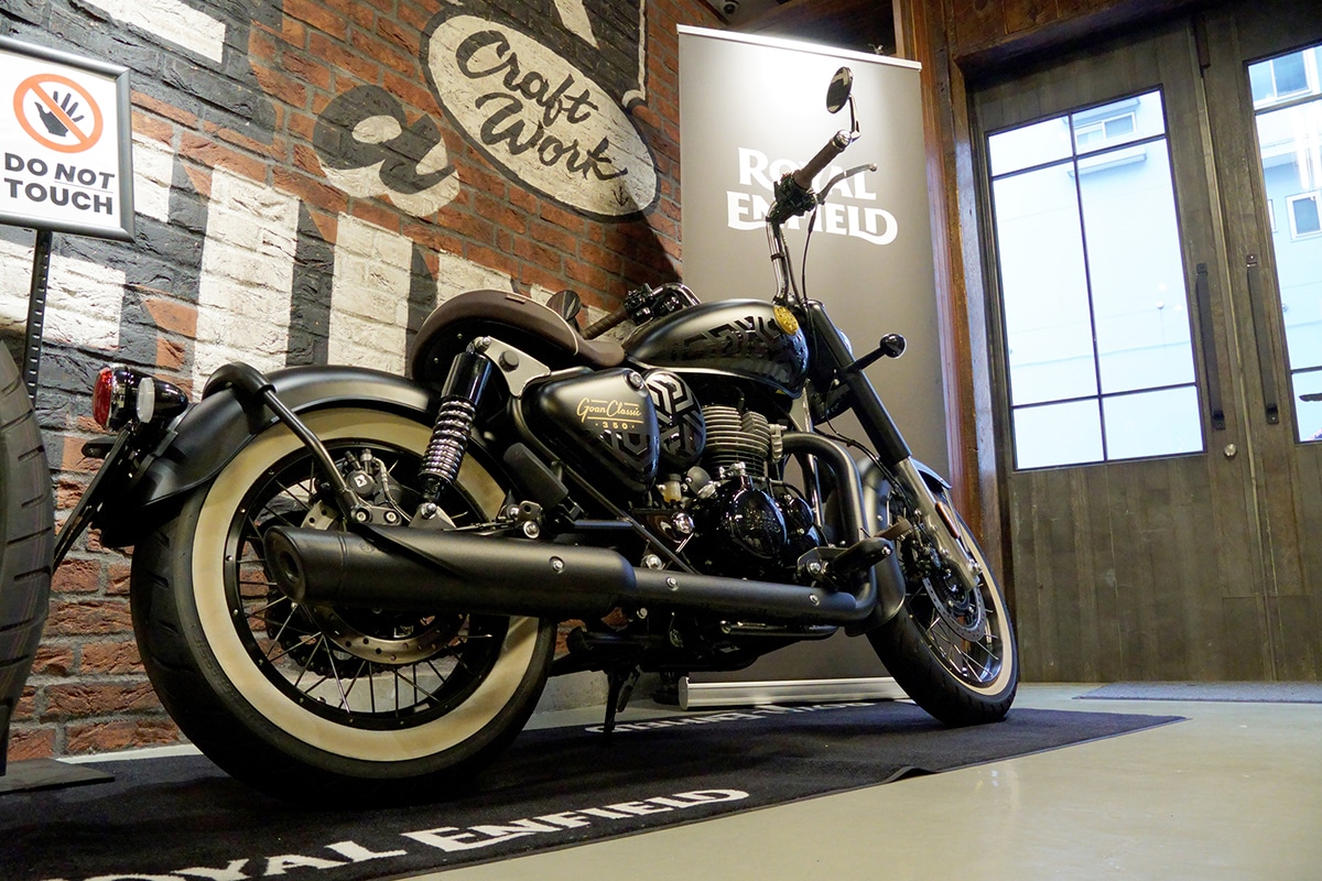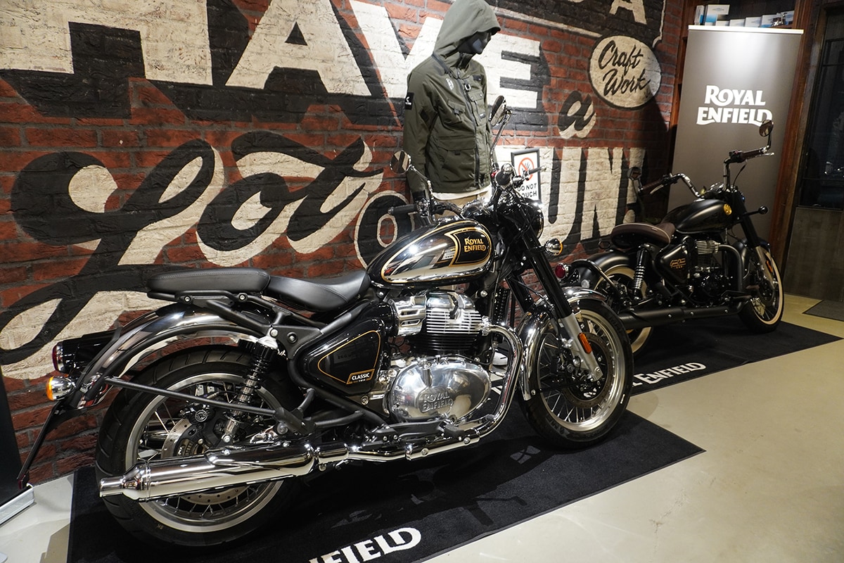 バイク関連のディスプレイが数多く並んでいる店内の1階にあるガレージには、ロイヤルエンフィールド GOAN CLASSIC 350と、CLASSIC 650が鎮座。今日のイベントの雰囲気を高めている。