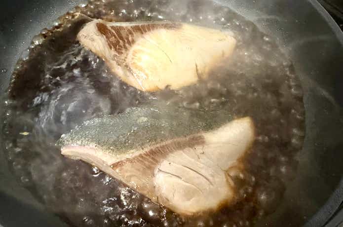 タレを煮詰める間に、魚をいったん取り出してから戻す作業を何度か繰り返すと、火が入りすぎるのを防げます。