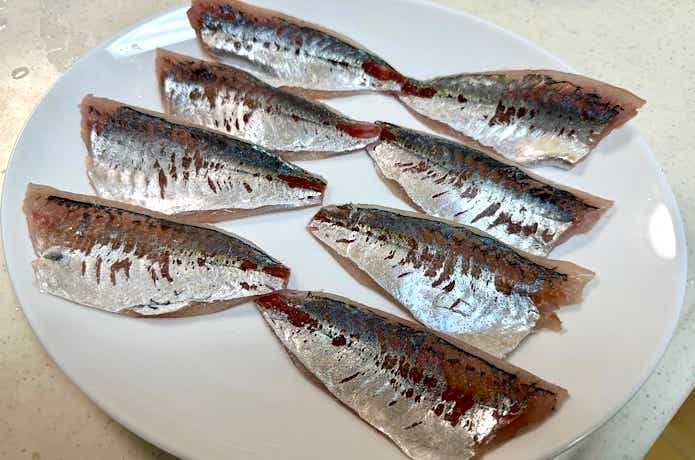 ①アジを三枚おろしにし、腹骨と血合い骨を除き、皮を引きます。分量外の塩を軽く当てて10分置き、出た水分を拭き取ります。