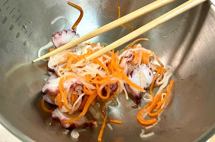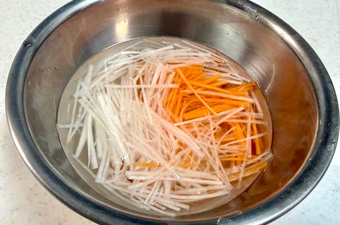 ②大根とにんじんを細切りにし、分量外の塩で作った塩分濃度約3%の塩水に30分ほど浸け、水気をしぼります。