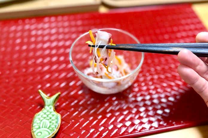 淡泊な白身に酢の酸味がほどよく入り、後味がすっきりとした祝い料理になります。
