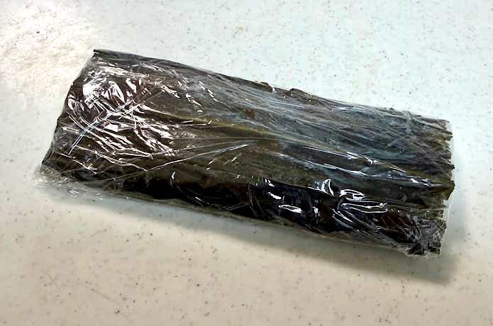 皮を引いた柵を昆布で挟み、ラップで密着させて半日冷蔵庫に置いておきます。