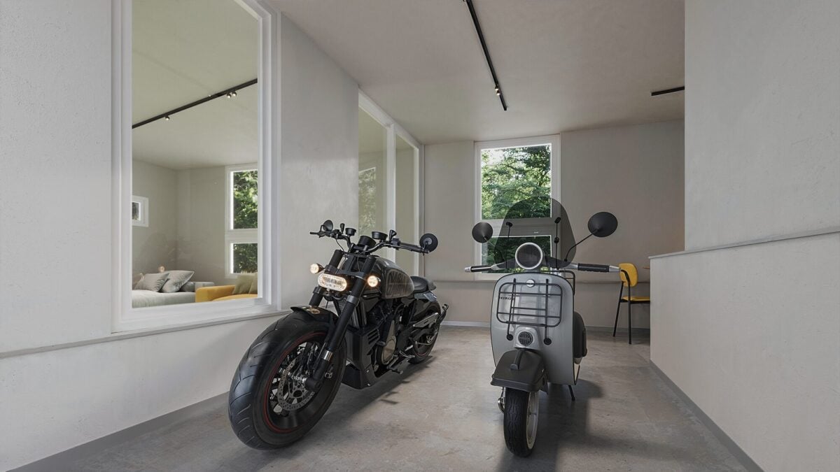 +BASEプロジェクトが手掛ける物件は、バイクの保管に最適な「屋内保管」が出来るよう、1戸につき最低1台大型バイクが駐車できる屋内ガレージスペースを提供いたします。