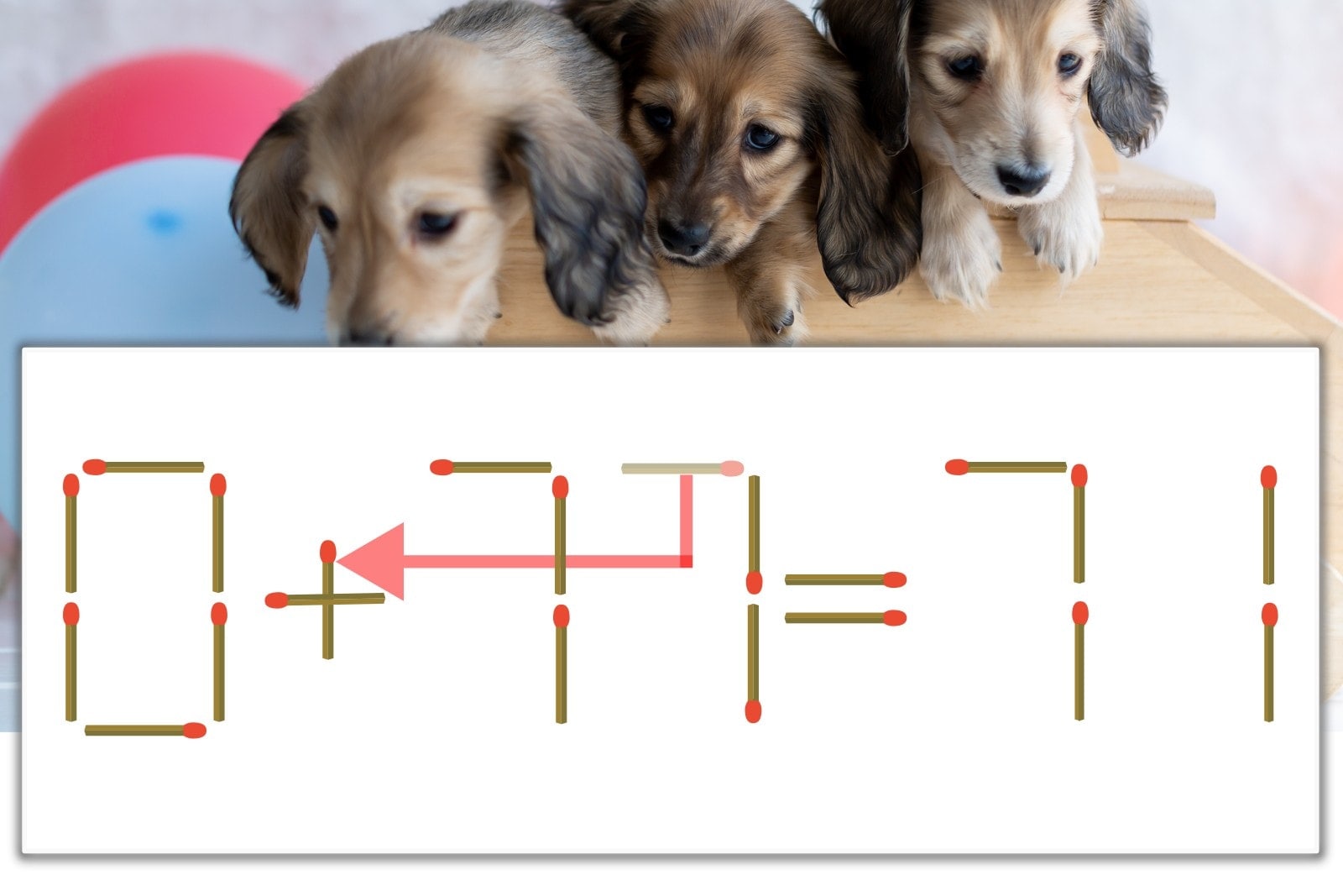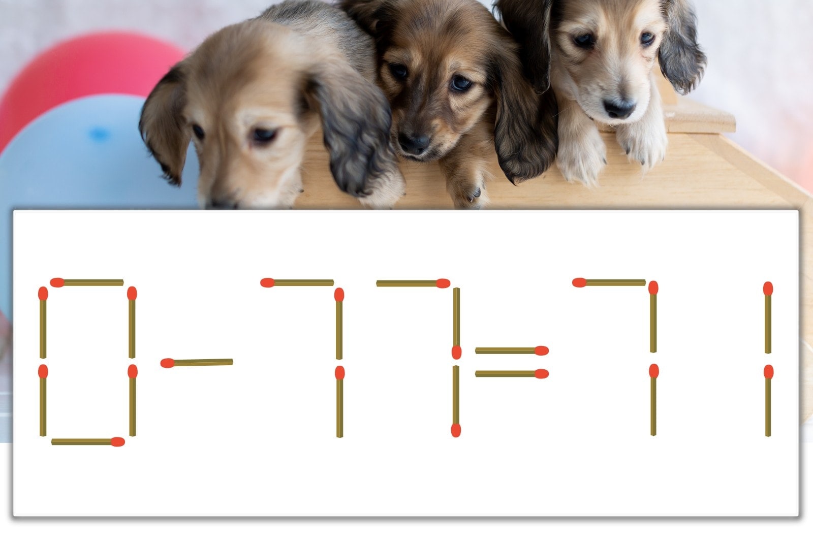 「7」を別の数字に変化させると答えが導き出せます。一の位の「7」のマッチ棒を1本移動して、「-」を「+」にしてみましょう。すると、「0+71=71」が成立します。