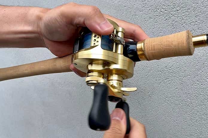 大型リールとは思えないパーミングのしやすさもカルコンMDの特徴で、ロングハンドルモデルがラインナップにあるのも嬉しいですね。