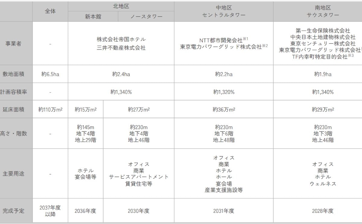 北地区では、帝国ホテルと三井不動産が、帝国ホテル新本館の建設と、オフィスやサービスアパート、賃貸住宅、商業施設が入るノースタワーを計画しています。建て替え期間中もホテルの営業を継続しながら進める方針で、帝国ホテルは、本館を2030年度まで営業し、2031年度から建て替え期間に入る予定としています。