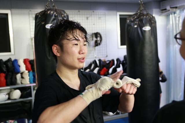 サンドバッグを叩く乾いた衝撃音と、パンチに合わせて上がる短い気合いが、熱気を帯びたジムの空気の中、拳四朗の言葉が静かに響いた。