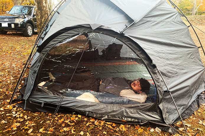 別売りオプションの「TPUウィンドウ フロント+サイドセット」(TPUルーフは標準装備)も購入したので、寒い時期でも、ぬくぬくと寝転んで外を眺められます。