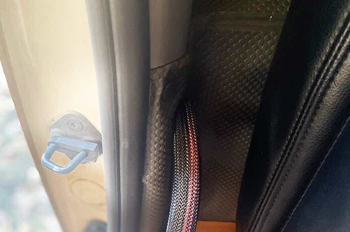 ハイエースに設置したYoutuberさんを参考にしたけれど、私の車種では、バッテリーから車内へケーブルを通す穴が同じ位置になく、鉄板をドリルでこじ開けるハメに……。
