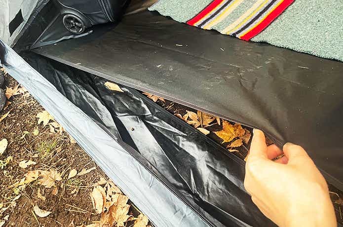 インナースカートはグランドシートと重なる設計で、スキマ風だけでなく、虫の侵入もしっかり防いでくれるので、安心して寝転がれます