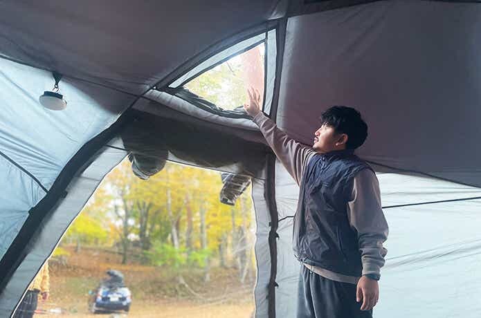 マツダ:基本はワンポール構造なので設営も楽ちん。慣れれば1人でも20〜30分程度で設営可能です。