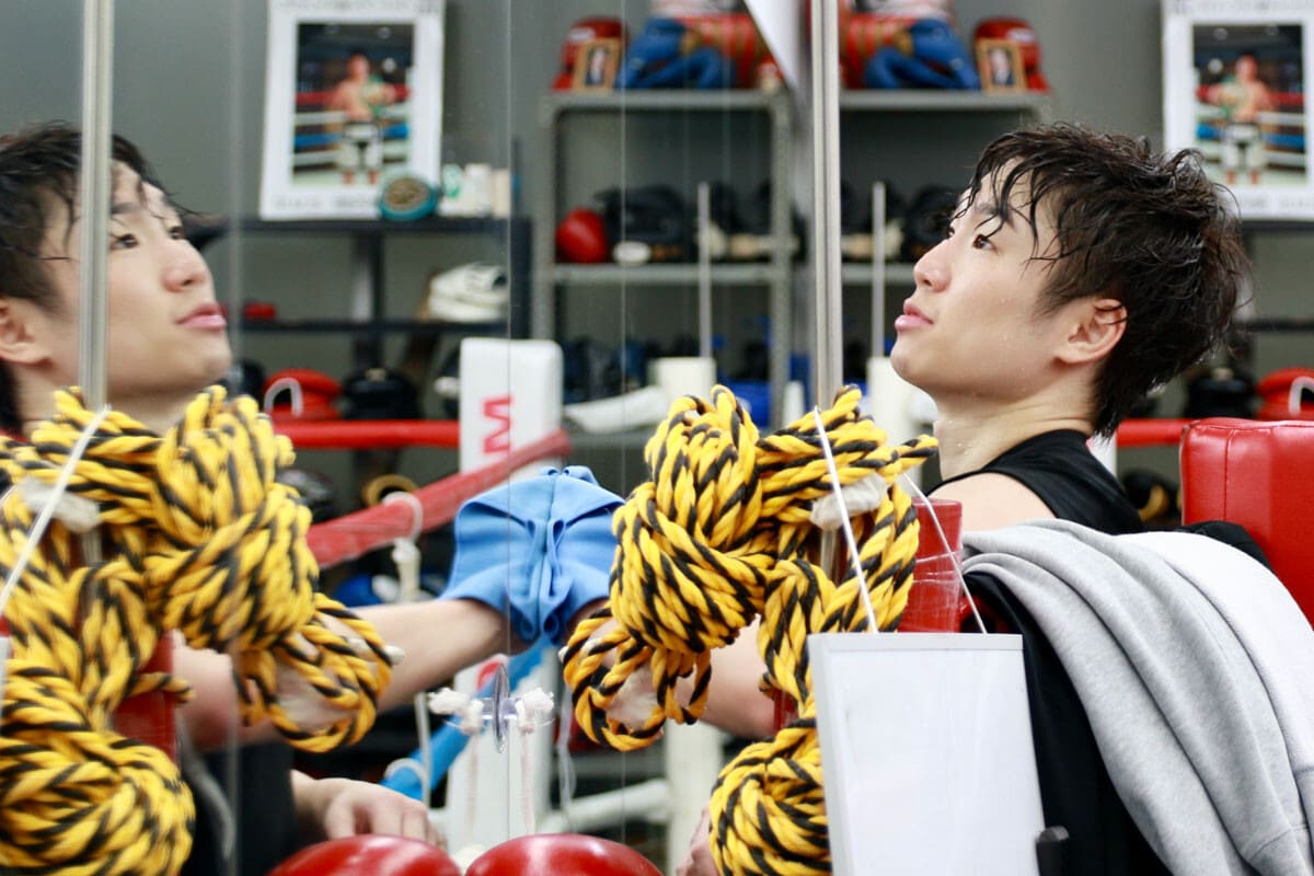 午後9時――。ジムの熱気が落ち着き始めた頃、拳四朗は練習を終えると、真新しい真っ白な雑巾を手に取り、リング脇の壁に貼られた姿見を磨き始めた。